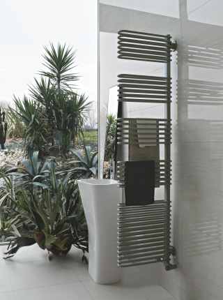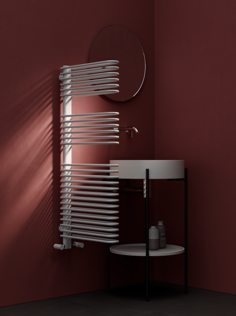 Un radiator cu personalitate sculpturală, având elemente tubulare din oțel de 14 mm diametru curbate în formă de U și dispuse perpendicular pe colectorul vertical. n ciuda aspectului său impresionant, structura se poate încadra chiar și în cele mai înguste spații ale băii ca un adevărat element de design interior, cu o personalitate puternică și multifuncțională. Acest radiator poate fi folosit ca radiator, port-prosop încălzit practic și element parțial de separare. Conceput pentru sisteme hidraulice, este disponibil în toate finisajele gamei de culori.