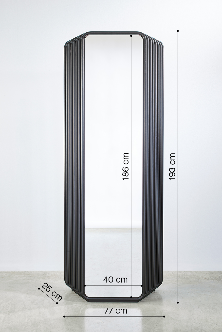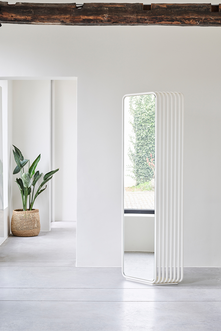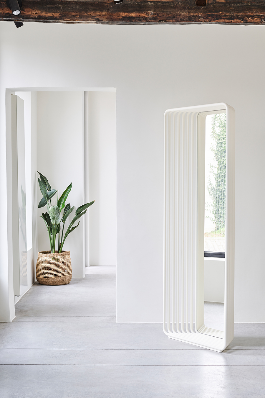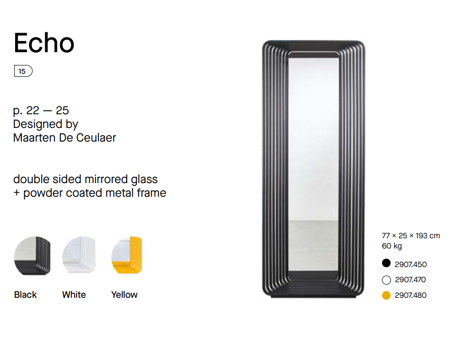 Oglinda ECHO a fost proiectată de Maarten de Ceulaer pentru Deknudt Mirrors. Numele face referire la seriile de rame tubulare adiacente, care dau impresia vizuală a unui ecou în dispariție. Tuburile se conectează doar în partea de sus și de jos, permițând vederea prin lucrare din lateral. Modul unic în care tuburile formează o sculptură este un omagiu adus mobilierului tubular modernist. Oglinda este prevazută cu o parte frontală și una din spate, ceea ce înseamnă că reflexiile pot fi privite de ambele părți, fiecare creând o experiență foarte diferită. Echo este disponibilă în culorile negru, alb sau auriu. Această oglindă freestanding poate fi fixată și pe perete, dacă este necesar.